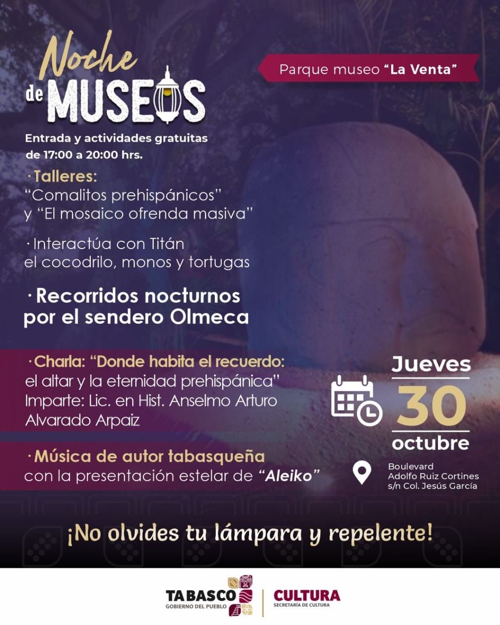 La Secretaría de Cultura del Estado de Tabasco invita al pueblo tabasqueño a disfrutar de dos grandes jornadas de la “Noche de Museos”, que se llevarán a cabo el sábado 25 y jueves 30 de octubre, con entrada gratuita en el Museo de Historia Natural “José Narciso Rovirosa Andrade” y el Parque Museo La Venta, respectivamente.
